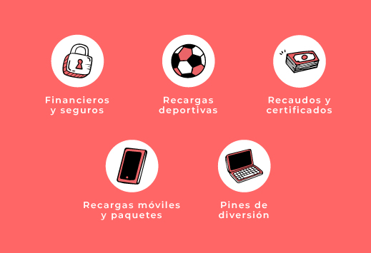Contamos con un amplio ecosistema digital de servicios que incluye: recargas a celular y compra de paquetes de datos, recargas de apuestas deportivas, pines de entretenimiento como Netflix, Spotify y DirecTV, recaudo de servicios públicos, y recargas y retiros de billeteras digitales como Powwi, Ding, Dale, Tepaga, Claropay y Movii. Además, ofrecemos servicio de Corresponsalía Bancaria con Bancolombia y Banca digital con Grupo Aval (Banco de Bogotá, Banco de Occidente, Banco Popular y AV Villas) BBVA y Nequi.