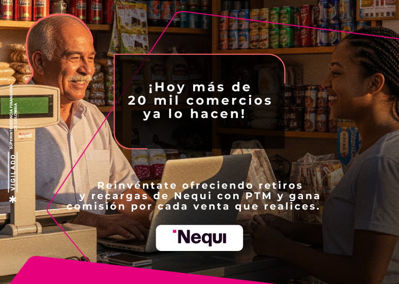 Con Nequi en tu comercio podrás ofrecer recargas y retiros de forma fácil y segura.